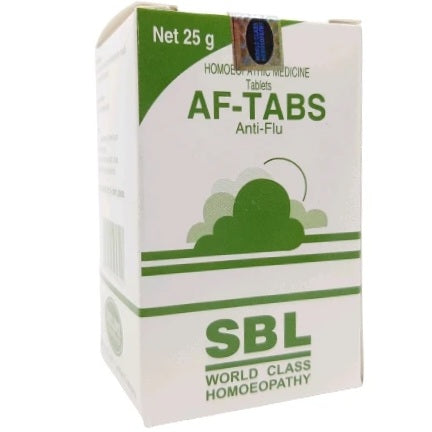 AF-Tabs SBL is a product of SBL’s Research and Development and is a combination of well proven drugs of homoeopathy therapeutics which bring quick and significant attenuation of signs and symptoms of influenza and is highly effective in common cold. The specific signs and symptoms of influenza e.g. malaise, headache, pain in the back and limbs, chills, anorexia, sneezing, blocked nose, watery nasal discharge, cough, flushing of face, suffused conjunctiva, hyperaemic fauces and tenderness over the sinuses are remarkably attenuated on the 2nd day in patients receiving AF-Tabs.