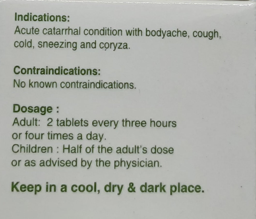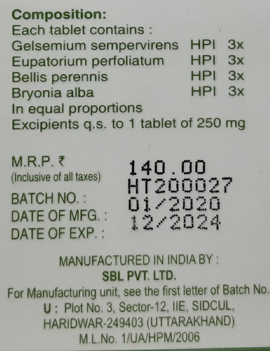 Arsenicum Album – 200: Nose feels stopped up. Sneezing without relief. Burning throat, unable to swallow. High temperature. Complete exhaustion with restlessness, Burning in chest. Suffocative catarrh, cramps in calves. Swelling of feet. Gelsemium Sempervirens – 200: Sneezing; fullness at root of nose. Dryness, Throat feels rough, burning. Loss of power of muscular control. Cramp in muscles of forearm. Dry cough, with sore chest and fluent coryza. Pulse slow, full, soft, compressible. Chilliness up and down back. Heat and sweat stages, long and exhausting. Eupatorium Perfoliatum – 200: Coryza, with sneezing. Hoarseness and cough, with soreness in chest; great soreness of muscles and bones. Aching pain in back. Aching in bones of extremities with soreness of flesh. Aching in arms and wrists. Bellis Perennis – 200: Excellent remedy for sprains and bruises. Complaints due to cold food or drink when the body is heated, and in affections due to cold wind. Joints sore, muscular soreness. Bryonia Alba – 200: Complaints that come up when warm weather begins after cold days. Chill with external coldness, dry cough, stitches. Internal heat. Sour sweat after slight exertion. Easy, profuse perspiration. Excipient q.s. to one tablet of 100 mg