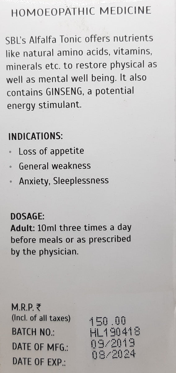 SBL Alfalfa Tonic takes care of debility specially caused by wasting diseases like Tuberculosis, Typhoid, Irritable Bowel Syndrome (IBS), Malignancies, and Diabetes mellitus. It is recommended during Pregnancy and Lactation and above all it increases appetite. SBLs Alfalfa Tonic contains mother tinctures of Alfalfa, Avena sativa and Ginseng. Alfalfa and Avena sativa provide essential minerals and vitamins whereas Ginseng builds resistance to fight against infections, works as revitalizing agent and removes mental and physical debility and helps in faster recovery.