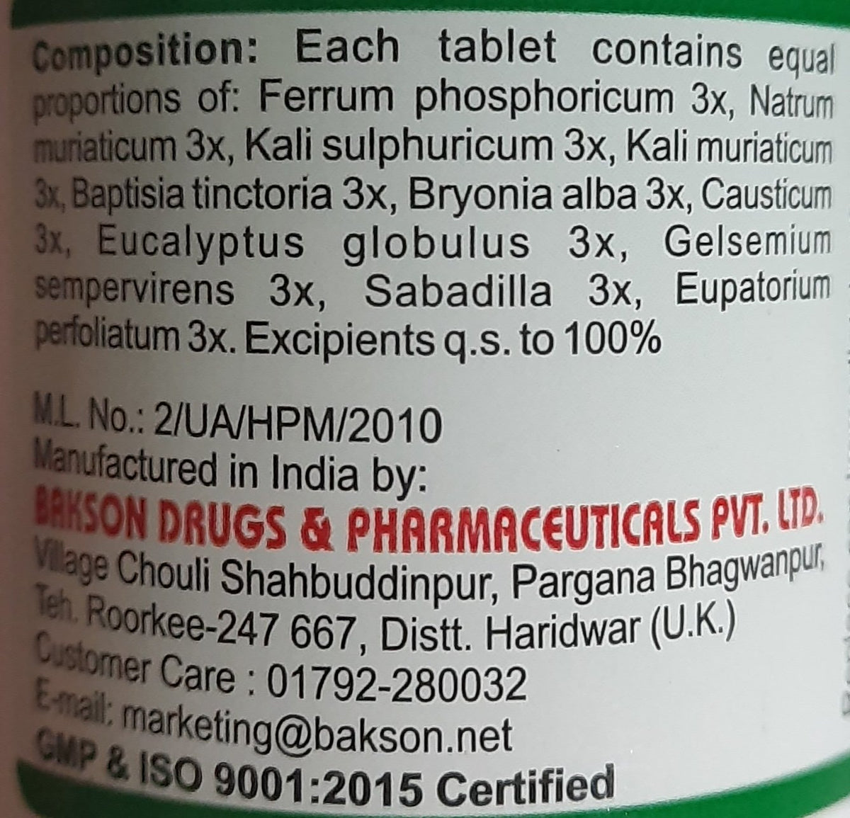 Ferrum phos. 3x, Natrum mur. 6x, Kali. sulph. 3x, Kali. mur. 3x, Baptisia tinc. 4x, Bryonia alba 4x, Causticum 6x, Eucalyptus gl. 3x, Gelsemium semp. 6x, Sabadilla 6x, Eupatorium perf. 3x.