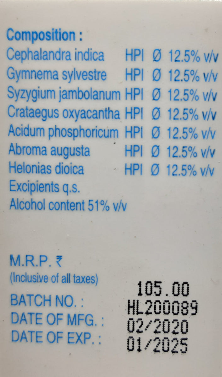 Cephalandra indica Q, Gymnema sylvestre Q, Syzygium jambolanum Q, Crataegus oxyacantha Q, Acidum phosphoricum Q, Abroma augusta Q, Helonias dioica .