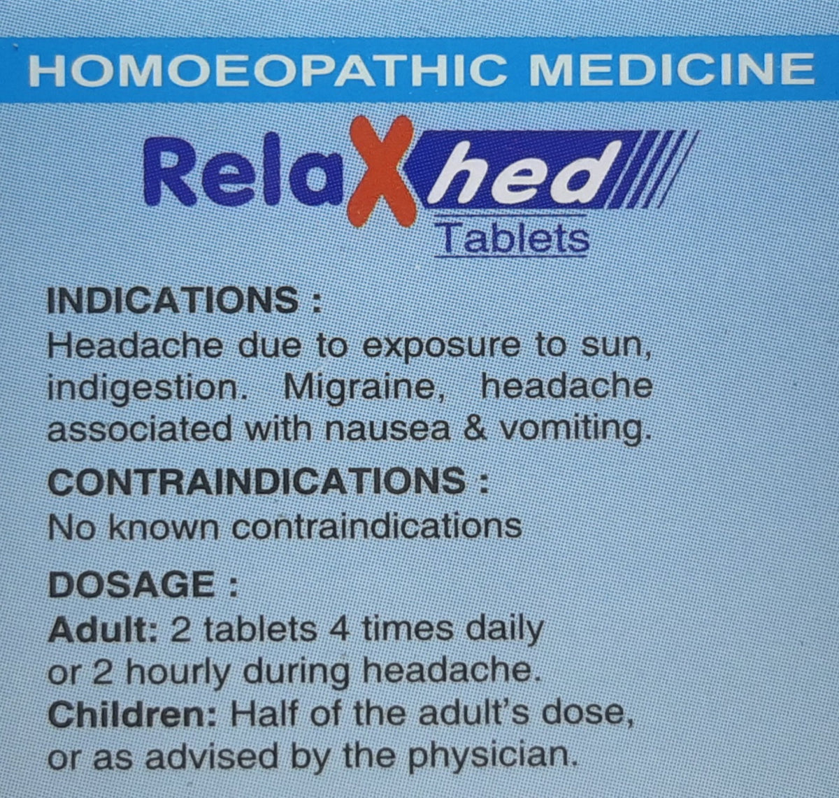 Sbl Relaxhed Tablets Indications: For heat of sun, indigestion, nervousness, mental stress, migraine, headache associated with nausea and vomiting.