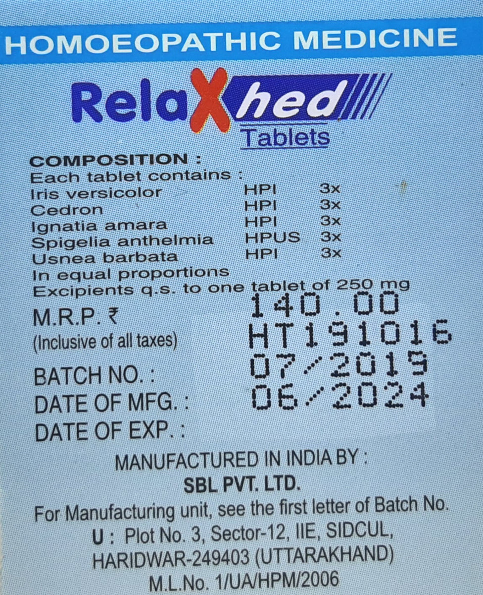 Ingredients/Composition: SBL Relaxhed Tablets Contains: Iris versicolor 3x, Cedron 3, Ignatia amara 6x, spigelia anthelmia 6x, Usnea barbata 3x.